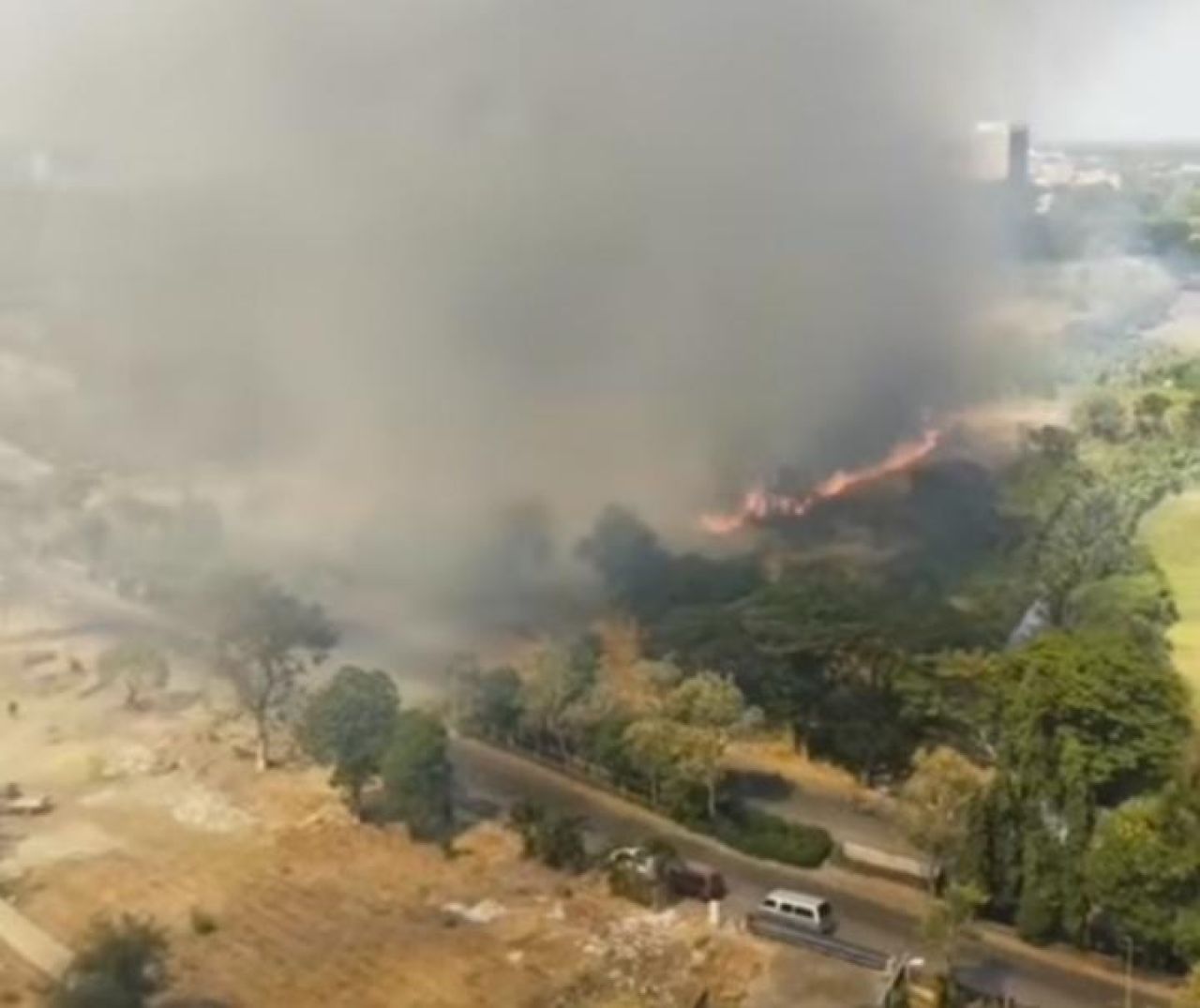 Beredar pula juga video di media sosial Instagram, yang merekam terjadinya kebakaran tersebut dengan bumbungan asap tebal dan tinggi yang menyebar ke jalan raya.