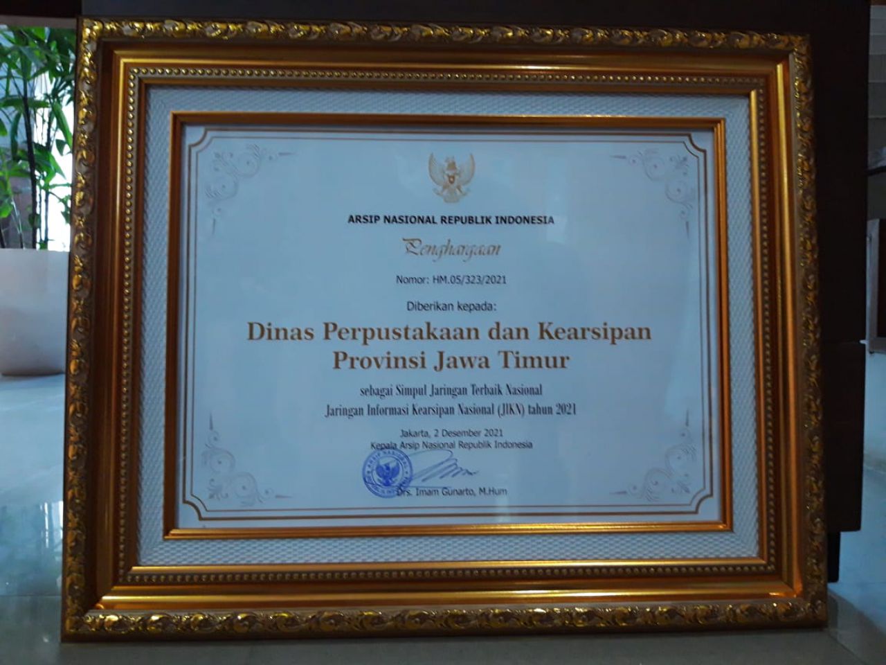 Penghargaan berupa piagam tersebut diperoleh berdasarkan Keputusan Kepala Arsip Nasional RI No. 383 Tahun 2021 tentang Penetapan Simpul Jaringan Terbaik Nasional tahun 2021 dengan skor 223,8. Selain Pemprov Jatim, penghargaan yang sama diberikan kepada Pemprov Aceh, Pemkot Bukittinggi Sumatera Barat, Pemkab Bogor Jawa Barat, dan Pemkab Magelang Jawa Tengah.