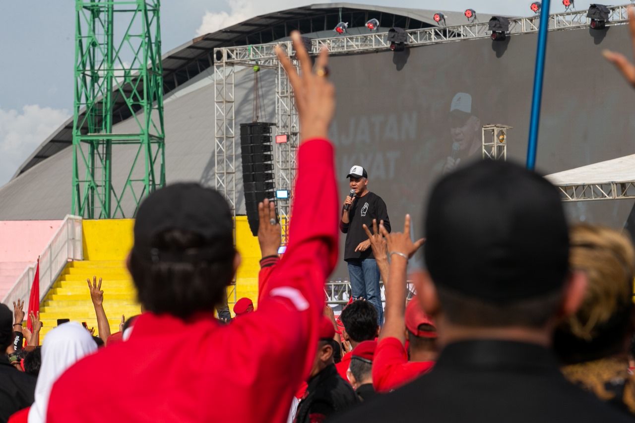 Euforia massa di stadion meledak. Ganjar mengajak seluruh kader parpol pengusung, semua relawan Ganjar-Mahfud, dan warga masyarakat menyatukan tekad dan kekuatan untuk memenangkan Pemilu 14 Februari 2024.