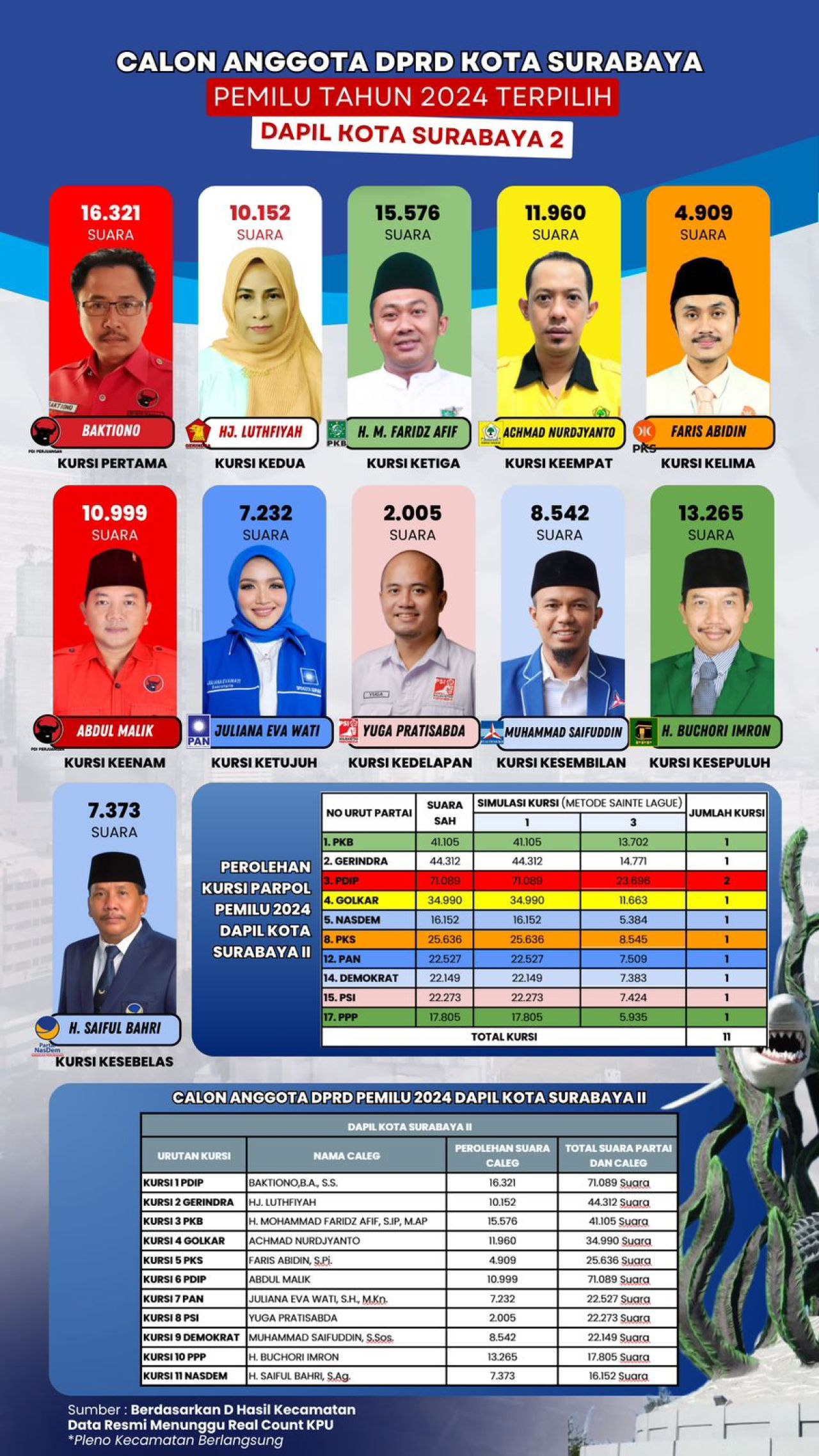 Berdadarkan data C1 dan D Hasil kecamatan update 7 Maret 2024 lalu. Dalam hasil sementara real count khusus Dapil 2 Kota Surabaya meliputi wilayah kecamatan Tambaksari, Pabean Cantian, Semampir dan Kenjeran sejumlah dengan alokasi 11 kursi DPRD Kota Surabaya, terlihat akan potensi lolos menjadi anggota dewan.