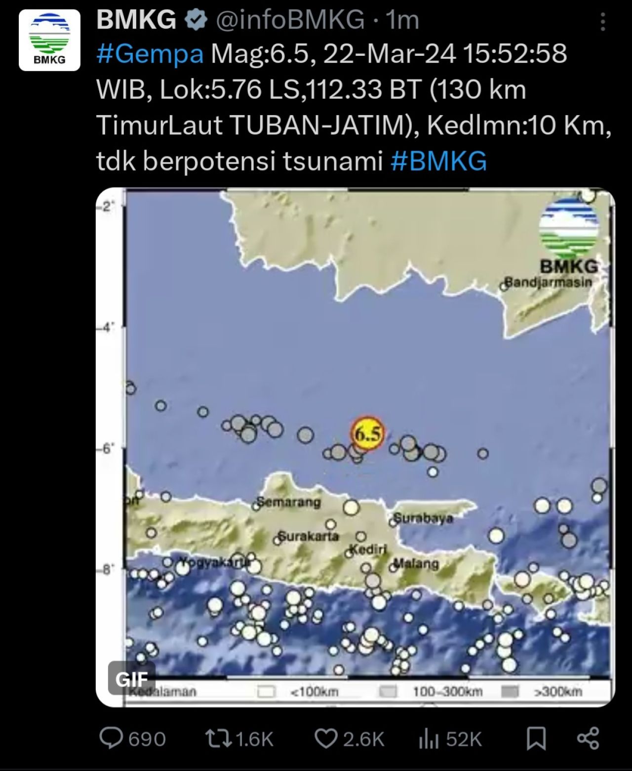Dari laporan BMKG melalui akun resmi X, gempa susulan ke tiga ini memiliki kekuatan 6.5 Magnitudo, #Gempa Mag:6.5, 22-Mar-24 15:52:58 WIB, Lok:5.76 LS,112.33 BT (130 km TimurLaut TUBAN-JATIM), Kedlmn:10 Km, tdk berpotensi tsunami #BMKG