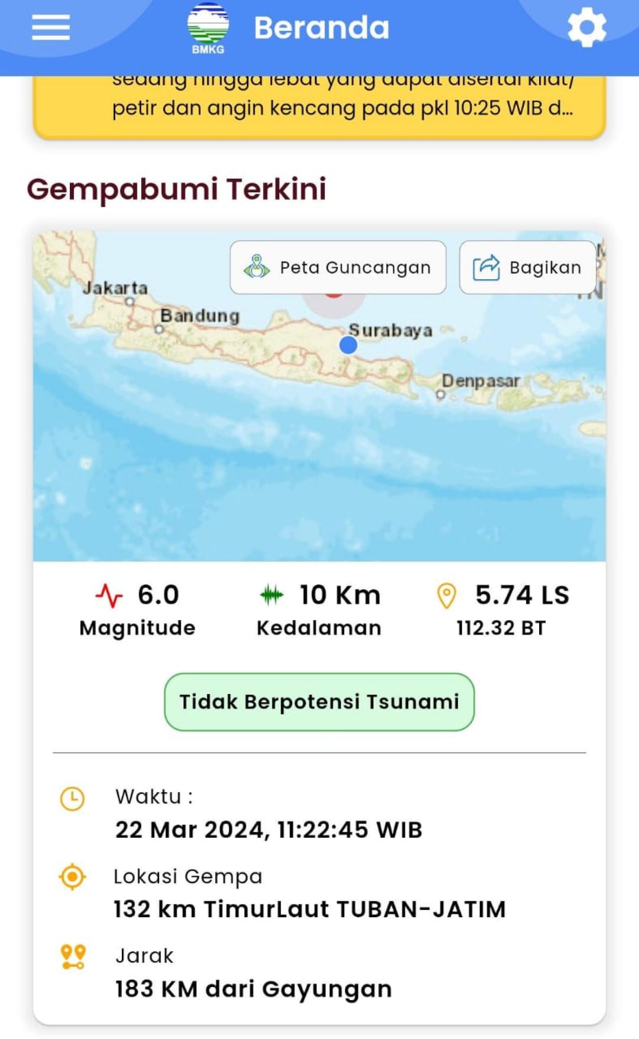 “Gempa terjadi lagi dengan Mag:6.5 pada pukul 15:52:58 WIB Jumat (22/3/2024), Lok:5.76 LS,112.33 BT (130 km TimurLaut Tuban Jawa Timur), Kedlmn:10 Km, tdk berpotensi tsunami. (odp-tm),” tulis keterangan BMKG.