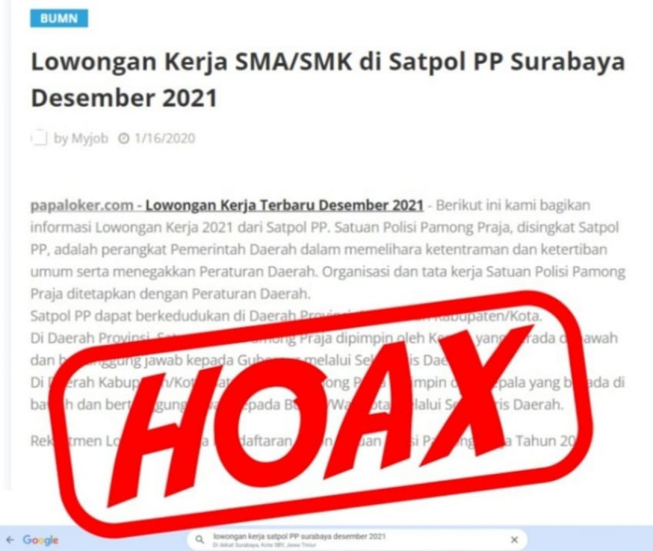 "Kami pastikan informasi tersebut tidak benar alias hoax. Sebab, Satpol PP Kota Surabaya untuk tahun 2021 dan 2022 belum membuka pendaftaran untuk menjadi anggota atau bagian dari Satpol PP," kata Kepala Satpol PP Kota Surabaya, Eddy Christijanto, Sabtu (18/12/2021).