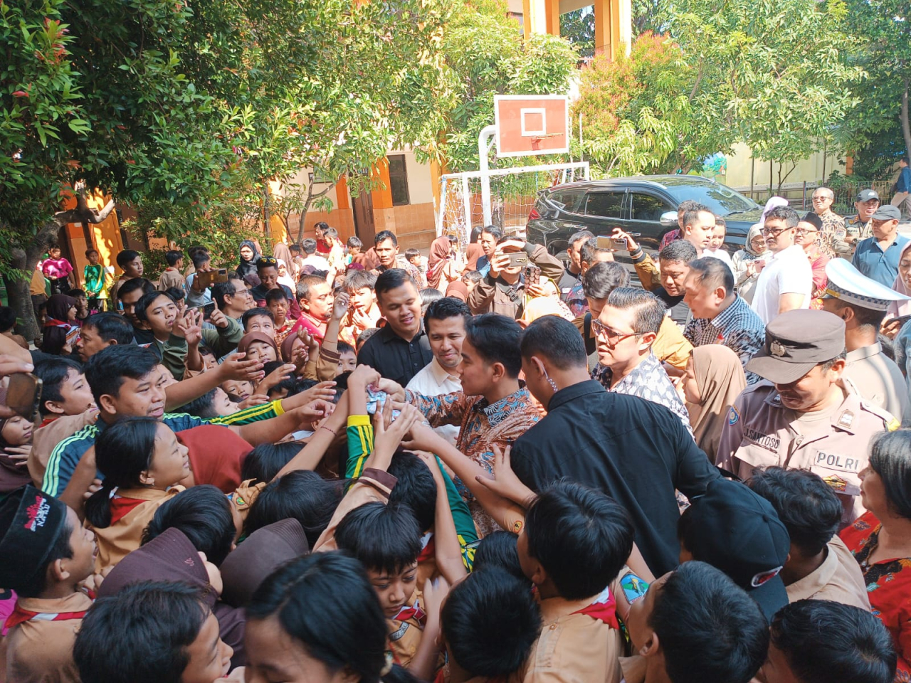 Diketahui, Gibran tiba sekitar pukul 08.15 WIB. Kedatangan Gibran kali ini disambut para relawan 02 juga sejumlah siswa SMA yang lengkap memakai seragam putih abu-abu. Terlihat juga, Ketua Projo Jatim Bayu Airlangga.