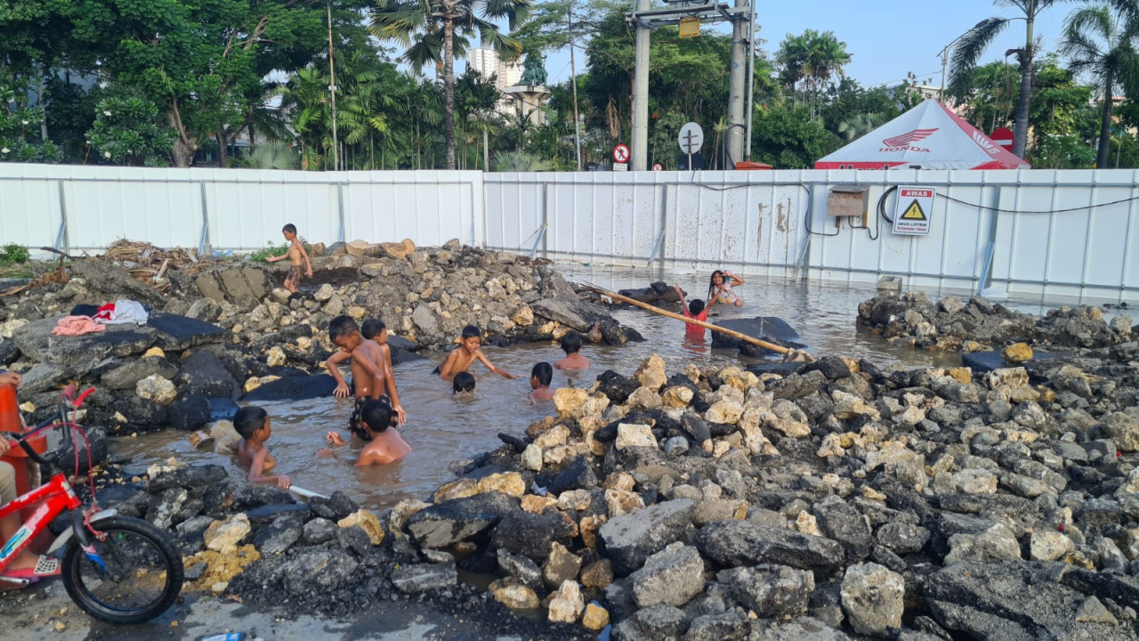 Pipa PDAM Bocor, Air Tumpah, Anak-Anak Bermain di Kubangan