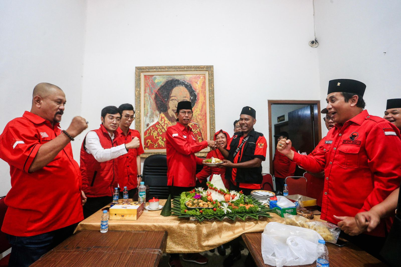 Adi memotong tumpeng dan diserahkan kepada kader banteng di akar rumput. “Kita serahkan pada kader partai di Anak Ranting sebagai simbol ujung tombak pergerakan partai di rakyat,” ujar Adi usai serahkan kepada Syarifudin dari Anak Ranting PDI Perjuangan RW 4 Kelurahan Tembok Dukuh.