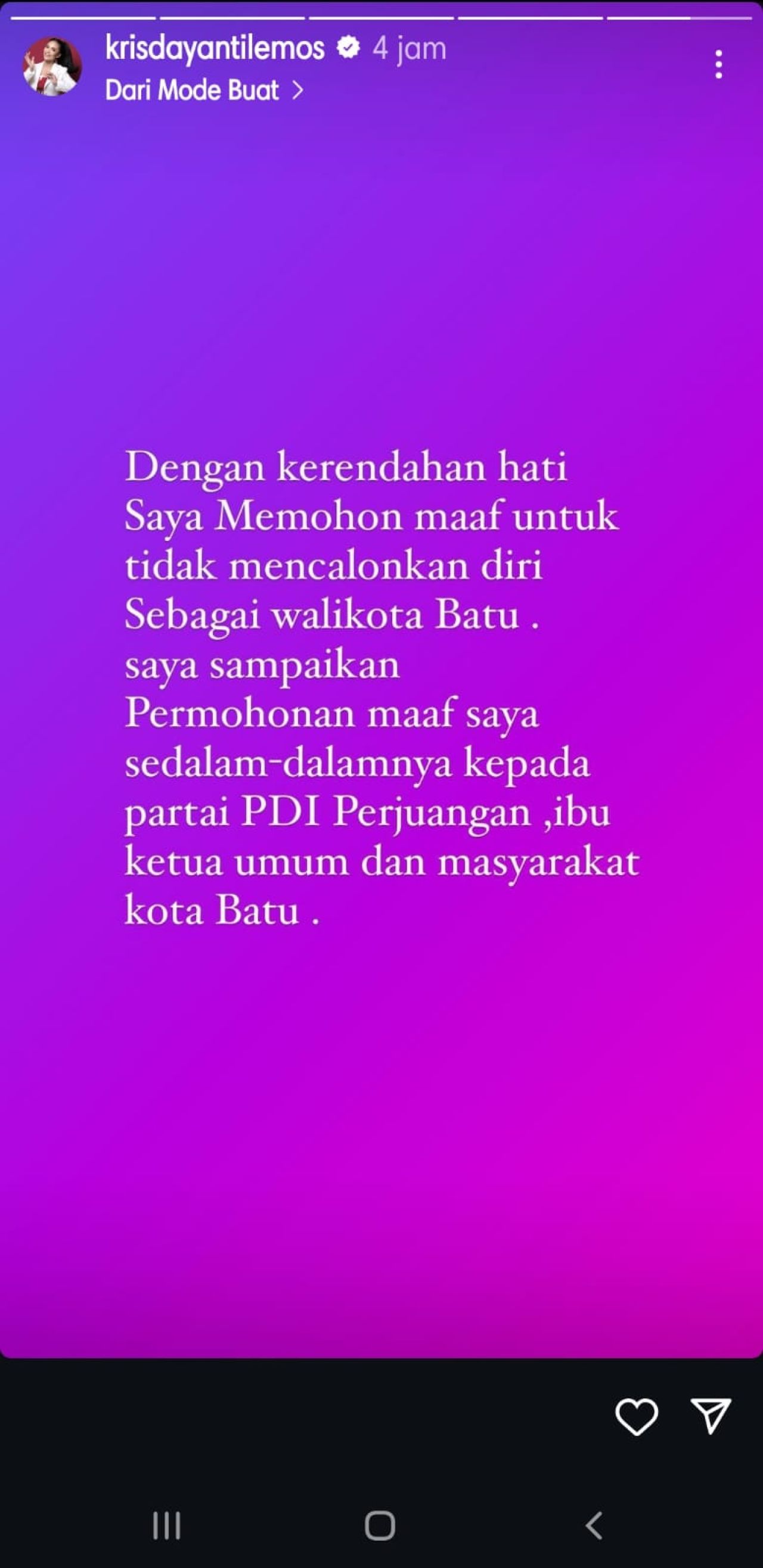 Krisdsyanti menyampaikan melalui unggahan Insta Story di instagramnya @krisdayantilemos pada Kamis malam (22/8/2024) sekitar pukul 20.00 WIB. Ia menyampaikan permohonan maaf yang dalam karena memilih untuk mundur sebagai calon Wali Kota Batu.