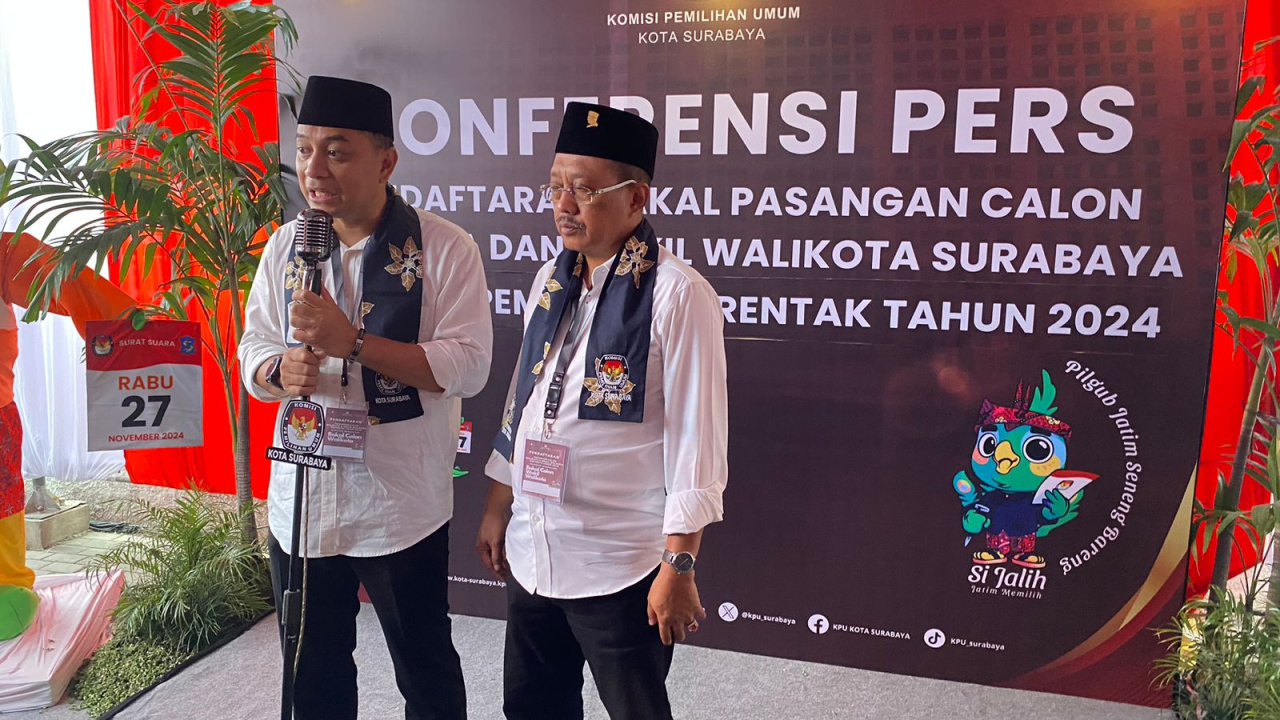 selalu.id - Pasangan calon petahana Eri Cahyadi-Armuji resmi melakukan pendaftaran calon wali kota dan wakil wali kota untuk Pilwali 2024, di Kantor KPU Surabaya, Rabu (28/8/2024).