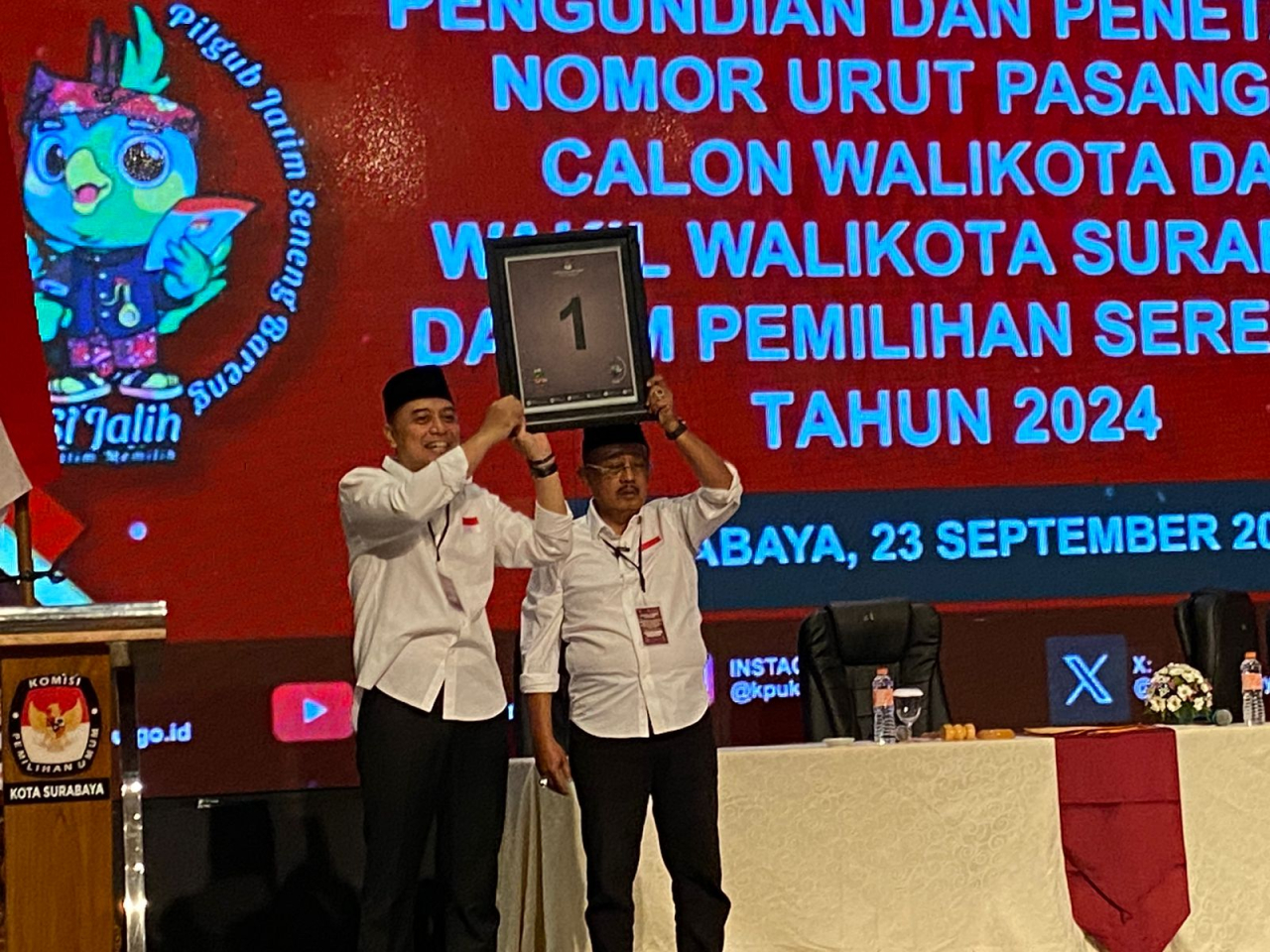 “Alhamdulillah pengundian ini kita dapat nomor 1 masio dredeg iki mau. Eyel-eyelan sampai nang dukur (di atas panggung),” kata Eri Cahyadi, usai pengambilan undian nomor urut suara, Hotel Harris Surabaya, Gubeng, Senin (23/9/2024).