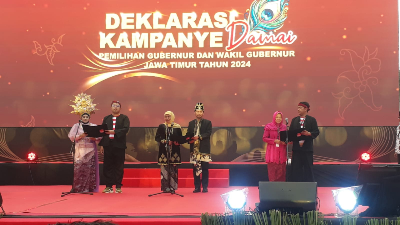 Sementara itu, selain ketiga paslon, hadir pula Pj Gubernur Jatim, Adhy Karyono bersama sejumlah pejabat pemprov lainnya juga Satgas Demokrasi, Pangdam V Brawijaya, serta Kapolda Jatim. Meski cuaca terlihat mendung dan sempat hujan gerimis, namun acara Deklarasi Kampanye Damai ini masih berjalan dengan lancar.