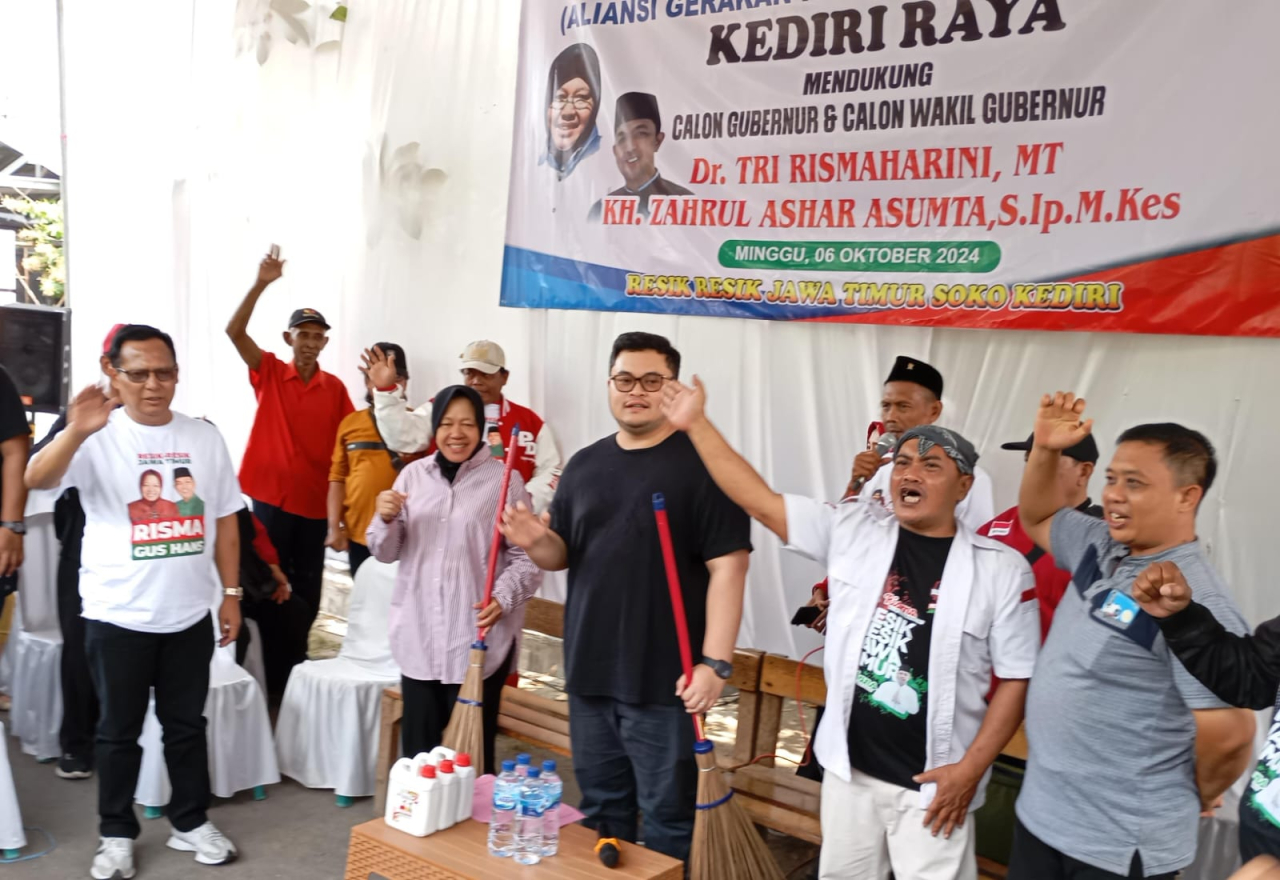 selalu.id- Laskar Aliansi Gerakan Rakyat (AGRARIS) Kediri Raya mendeklarasikan dukungan kepada pasangan calon nomor urut tiga Risma-Gus Hans di konstetasi Pilgub Jawa Timur 2024), Minggu (6/10/2024) lalu. Dukungan tersebut diwujudkan melalui simbolik pemberian sapu lidi kepada Risma