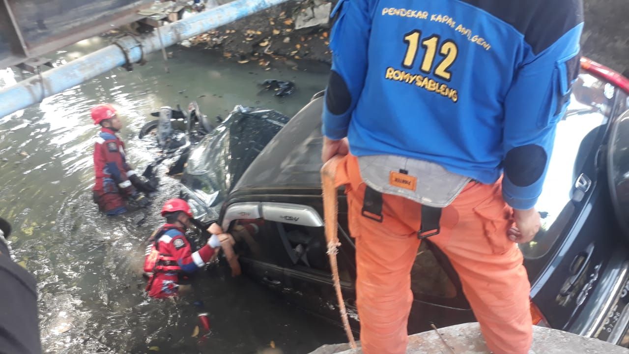 Dramatis! Begini Evakuasi Penumpang Mobil Nyemplung Sungai di Surabaya