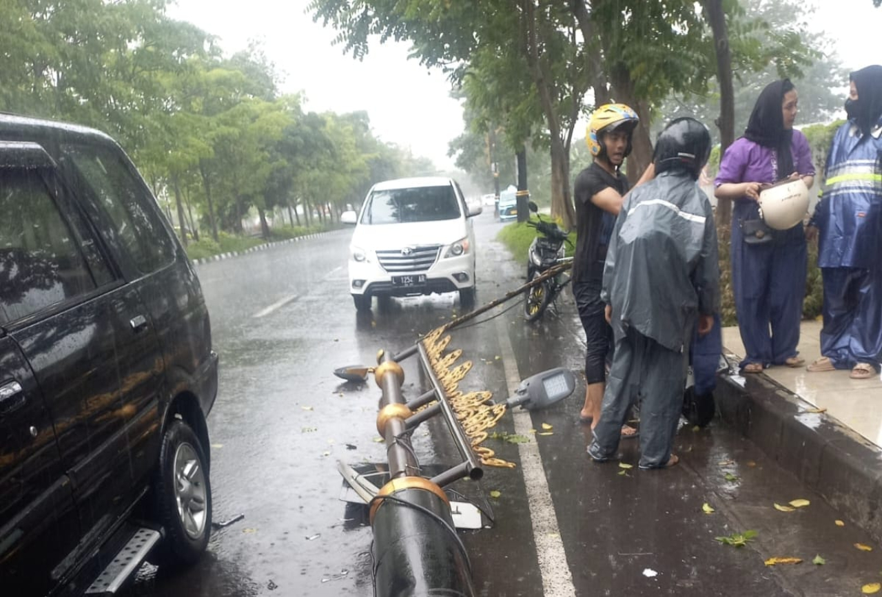 selalu.id - Sebuah tiang Penerangan Jalan Umum (PJU) roboh hingga menimpa pengendara motor saat hujan deras melanda Surabaya, di kawasan Jalan Dr. Ir. H. Soekarno (Merr), Gunung Anyar, Selasa (24/12/2024).