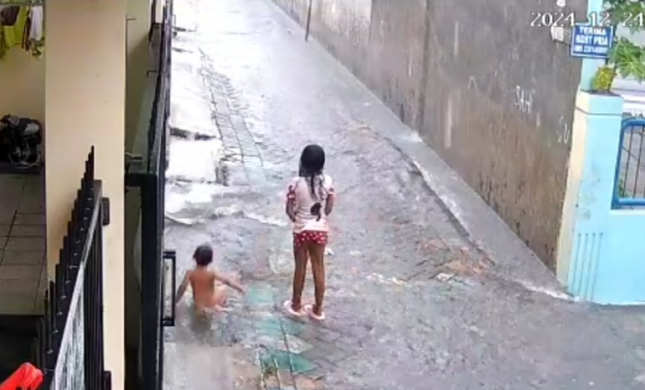 Dalam rekaman CCTV yang tersebar, terlihat tiga anak bermain di bawah guyuran hujan—dua anak laki-laki dan satu anak perempuan. Salah satu anak laki-laki tampak terlalu dekat dengan tepi selokan hingga akhirnya terpeleset masuk dan terseret arus deras.