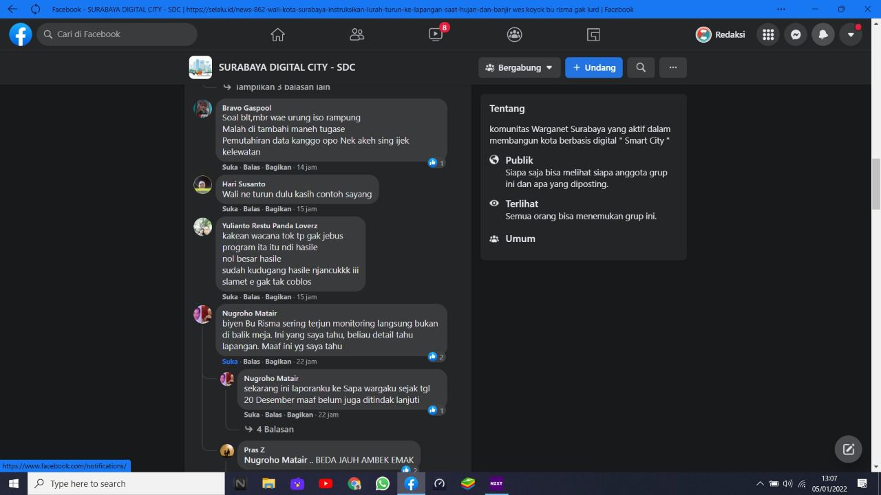 "Biyen Bu Risma sering terjun monitoring langsung bukan dibalik meja. Ini yang saya tahu, beliau detail tahu lapangan. Maaf ini yang saya tahu," tulisnya dalam komentar pstingan di grup Facebook Surabaya Digital City.