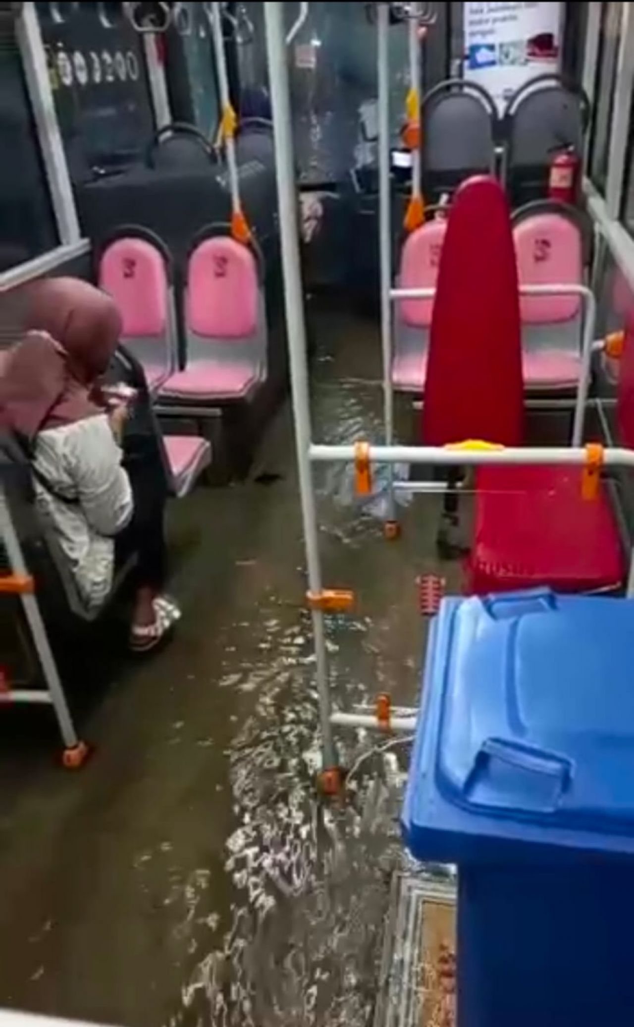 Terlihat dua penumpang wanita berjilbab tersorot kamera yang sedang kebingungan mengangkat kakinya takut terkena genangan air. Sementara itu terdengar suara wanita yang berbicara sembari tertawa heran dengan kondisi tersebut.