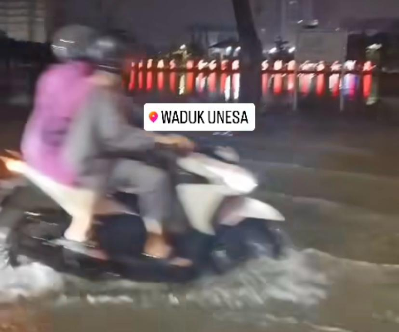 Beredar video yang memperlihatkan kondisi genangan di sekitar Danau Unesa hingga meluber ke jalan raya. Beberapa kendaraan yang melintas tampak mogok akibat terjebak banjir.