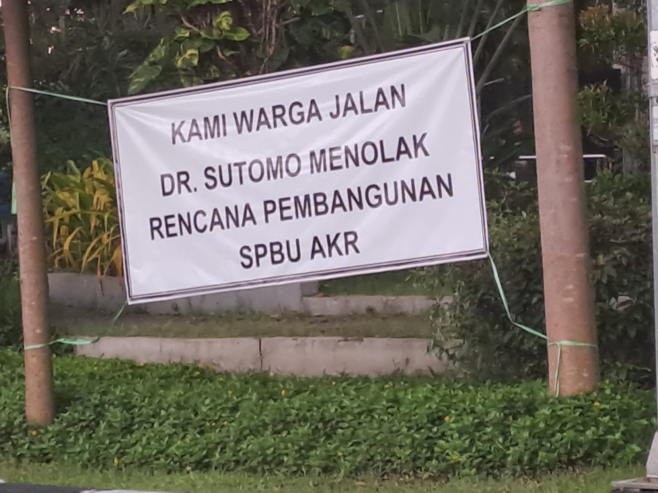 selalu.id - Rencana pembangunan Stasiun Pengisian Bahan Bakar Umum (SPBU) AKR di Jalan Dr. Soetomo menuai protes dari warga setempat. Sejumlah spanduk penolakan telah terpasang di sepanjang jalan sejak sepekan terakhir. Lokasi pembangunan SPBU berada di bekas tempat karaoke yang terletak di depan sebuah taman.