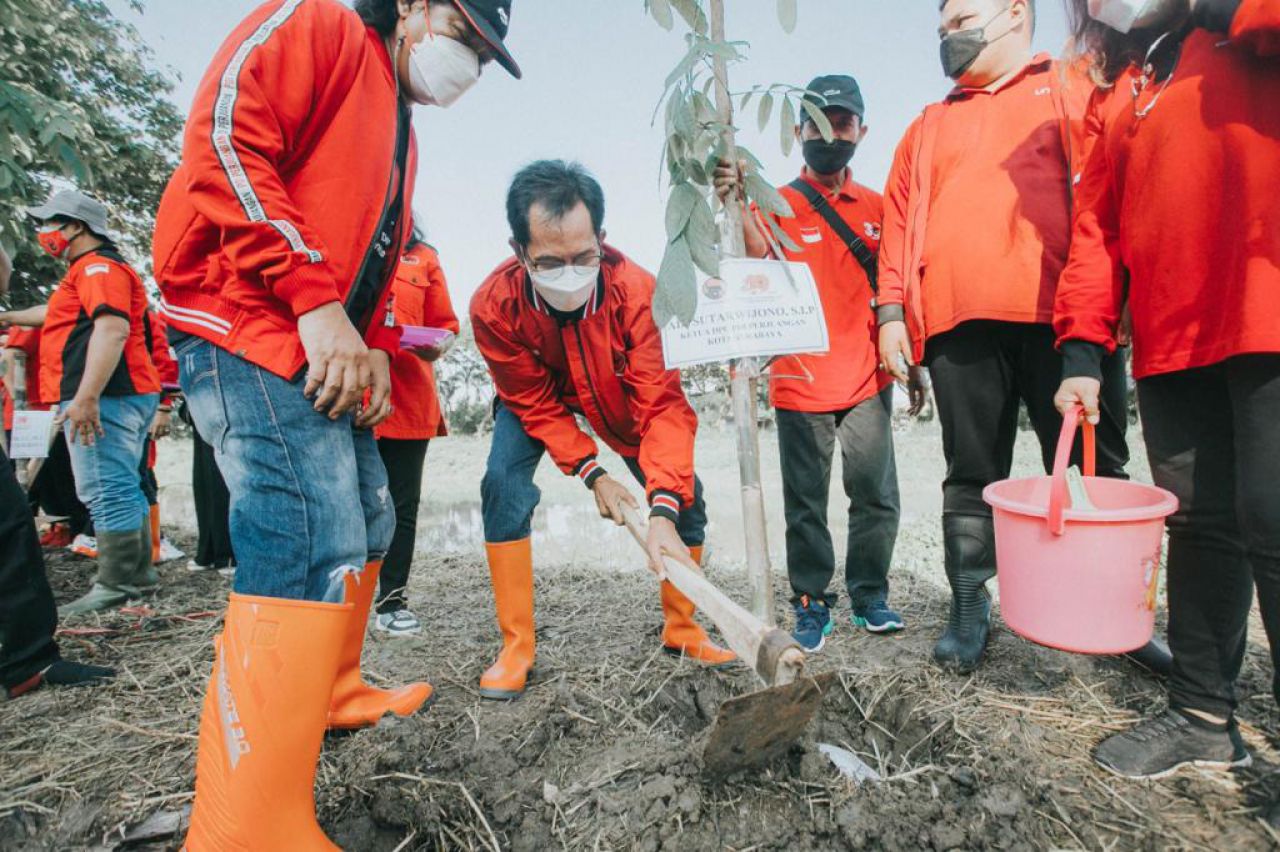 selalu.id - DPC PDI Perjuangan Kota Surabaya melakukan penanaman pohon di sepanjang bantaran sungai di kawasan Gunung Sari Indah, Kecamatan Karang Pilang, Minggu (23/1/2022).
